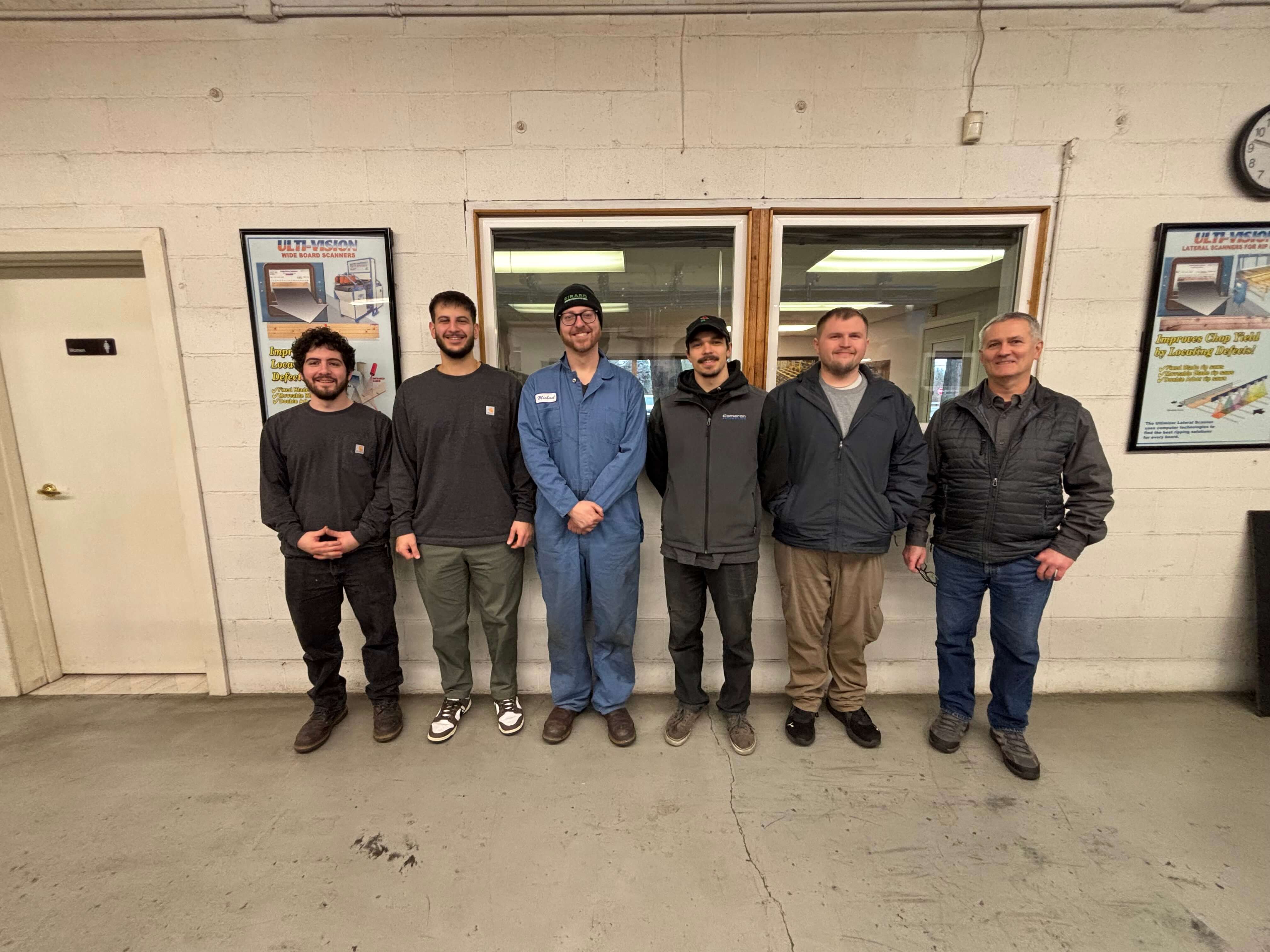 From left to right: Jesus Iglesias (Mechanical eng. and support), Elias Faris (Software and Support), Michael Giese 9 (Electrician, PLC Support, Machine Support), Cameron Rogers( Electrical, Machine support), Jordan Miller ( Software and support), David Dearth ( Drafting, Machine Parts Support)